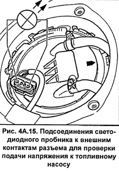 Připojte tester LED nebo voltmetr k externím kontaktům konektoru odpojeného od palivového čerpadla (viz obr. 4A.15).