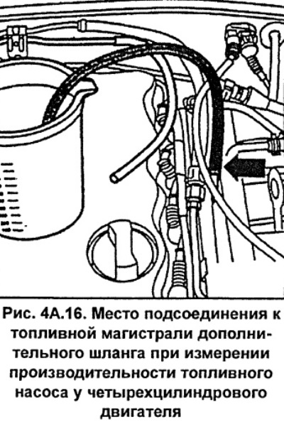 Místo zpětného vedení paliva připojte k palivovému vedení přídavnou hadici, jejíž volný konec spusťte do odměrné nádoby (viz obr. 4A.16).
