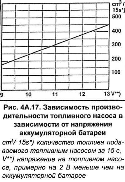 Podle grafu na obrázku 4A.17 určete výkon palivového čerpadla, přičemž vezměte v úvahu, že při běžícím startéru se napětí sníží o 2 V.